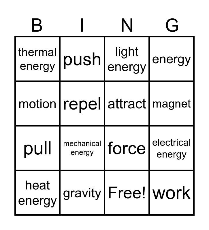 This bingo card has 17 words: Free!, heat energy, light energy, thermal energy, mechanical energy, energy, electrical energy, attract, magnet, repel, gravity, force, motion, push, pull, position and work.