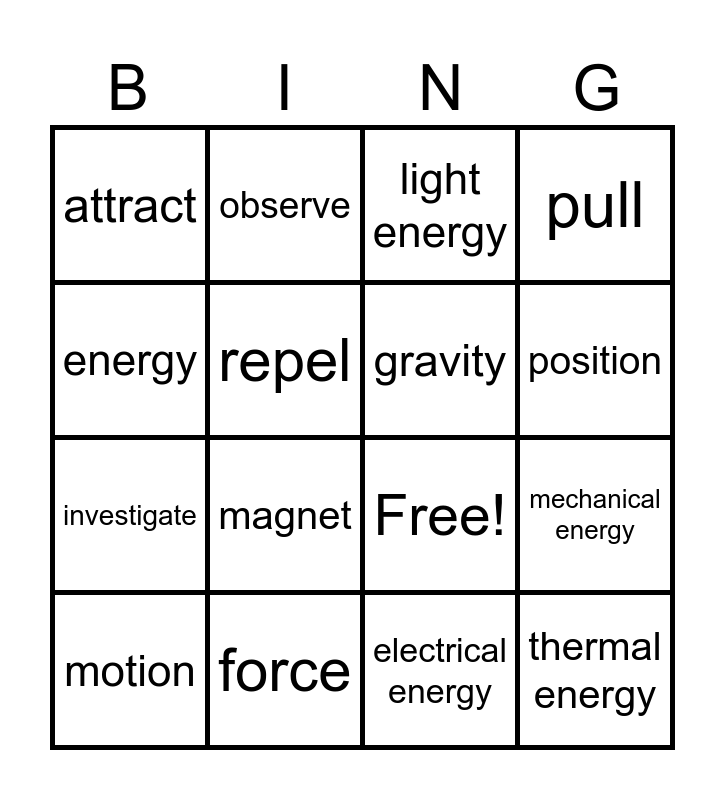 This bingo card has 19 words: Free!, heat energy, light energy, thermal energy, mechanical energy, energy, electrical energy, attract, observe, investigate, magnet, repel, gravity, force, motion, push, pull, position and work.