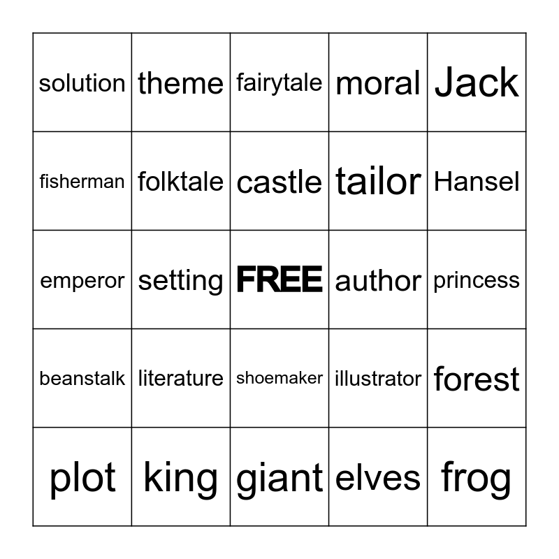 This bingo card has a free space and 29 words: plot, character, setting, problem, solution, fairytale, folktale, literature, author, king, princess, frog, giant, elves, Hansel, Gretel, shoemaker, beanstalk, Jack, emperor, illustrator, Henny Penny, tailor, fisherman, moral, theme, forest, castle and magic.