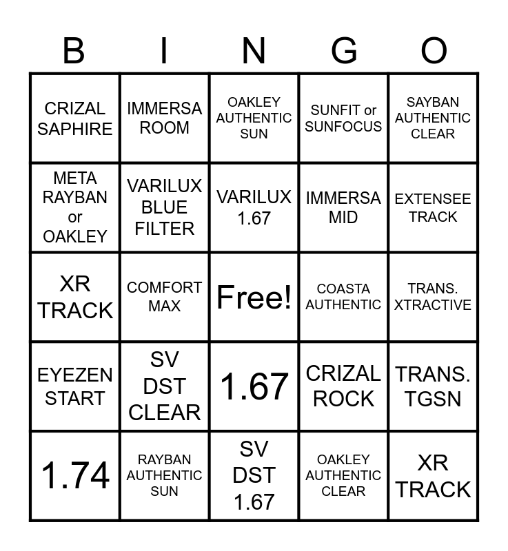 This bingo card has a free space and 24 words: SV DST CLEAR, RAYBAN AUTHENTIC SUN, VARILUX 1.67, 1.74, SAYBAN AUTHENTIC CLEAR, CRIZAL SAPHIRE, META RAYBAN or OAKLEY, IMMERSA ROOM, COASTA AUTHENTIC, 1.67, IMMERSA MID, XR TRACK, CRIZAL ROCK, TRANS. TGSN, VARILUX BLUE FILTER, OAKLEY AUTHENTIC CLEAR, TRANS. XTRACTIVE, OAKLEY AUTHENTIC SUN, EXTENSEE TRACK, COMFORT MAX, XR TRACK, EYEZEN START, SUNFIT or SUNFOCUS and SV DST 1.67.