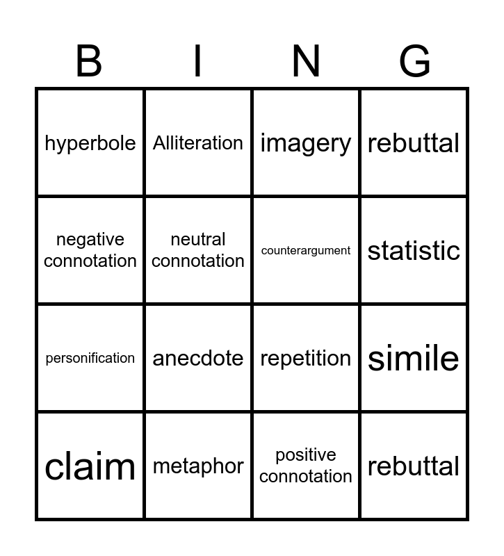 This bingo card has 16 words: metaphor, simile, imagery, hyperbole, personification, Alliteration, repetition, positive connotation, negative connotation, neutral connotation, claim, rebuttal, anecdote, statistic, counterargument and rebuttal.