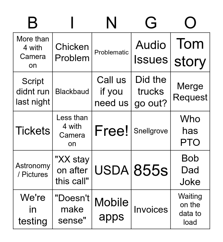 This bingo card has a free space and 64 words: Weather Chat, Marshall Muted, Bob audio issues, Bob Dad Joke, Alrighty Then, Lets get rollin, Chicken Problem, Connor complains about incentRev, Call us if you need us, Helpdesk, USDA, Gordon foods, Who has PTO, Tom story, Party Planning Committee, Script didnt run last night, Less than 4 with Camera on, More than 4 with Camera on, Hear people in background, Did the trucks go out?, "XX stay on after this call", Astronomy / Pictures, Audio Issues, Customer being crazy, EDI, Hop on another call, Somebody eating, What else we got?, Marshall security update, Anything else?, incentRev deals run ok?, Missing Contracts, Handling data for customer, Ill forward you that email, Merge Request, We're in testing, Distributor, Invoices, Premier, Blackbaud, Tickets, Snellgrove, We're waiting on them, Yardy, Widget, Waiting on the data to load, "Doesn't make sense", Schedule a meeting, 855s, Price File, Not able to replicate, Landed Errors, Mobile apps, You're muted, Punchout, Alpha, Problematic, Ottomate, Alliant, MediGroup, GLC, We'll monitor it, Tom technical question and More locations.
