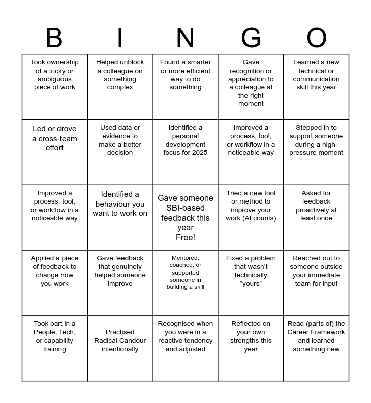 This bingo card has a free space and 24 words: Gave feedback that genuinely helped someone improve, Practised Radical Candour intentionally, Identified a personal development focus for 2025, Took part in a People, Tech, or capability training, Learned a new technical or communication skill this year, Took ownership of a tricky or ambiguous piece of work, Led or drove a cross-team effort, Helped unblock a colleague on something complex, Tried a new tool or method to improve your work (AI counts), Mentored, coached, or supported someone in building a skill, Improved a process, tool, or workflow in a noticeable way, Improved a process, tool, or workflow in a noticeable way, Fixed a problem that wasn’t technically “yours”, Reached out to someone outside your immediate team for input, Used data or evidence to make a better decision, Reflected on your own strengths this year, Asked for feedback proactively at least once, Found a smarter or more efficient way to do something, Stepped in to support someone during a high-pressure moment, Identified a behaviour you want to work on, Read (parts of) the Career Framework and learned something new, Applied a piece of feedback to change how you work, Gave recognition or appreciation to a colleague at the right moment and Recognised when you were in a reactive tendency and adjusted.