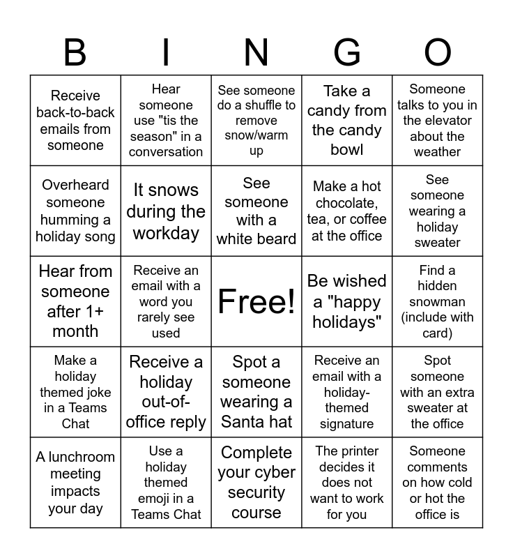 This bingo card has a free space and 24 words: Receive a holiday out-of-office reply, Use a holiday themed emoji in a Teams Chat, See someone with a white beard, A lunchroom meeting impacts your day, Someone talks to you in the elevator about the weather, Receive back-to-back emails from someone, Overheard someone humming a holiday song, Hear someone use "tis the season" in a conversation, Be wished a "happy holidays", Spot a someone wearing a Santa hat, Make a hot chocolate, tea, or coffee at the office, Hear from someone after 1+ month, Receive an email with a holiday-themed signature, Spot someone with an extra sweater at the office, It snows during the workday, The printer decides it does not want to work for you, Find a hidden snowman (include with card), See someone do a shuffle to remove snow/warm up, See someone wearing a holiday sweater, Receive an email with a word you rarely see used, Someone comments on how cold or hot the office is, Make a holiday themed joke in a Teams Chat, Take a candy from the candy bowl and Complete your cyber security course.