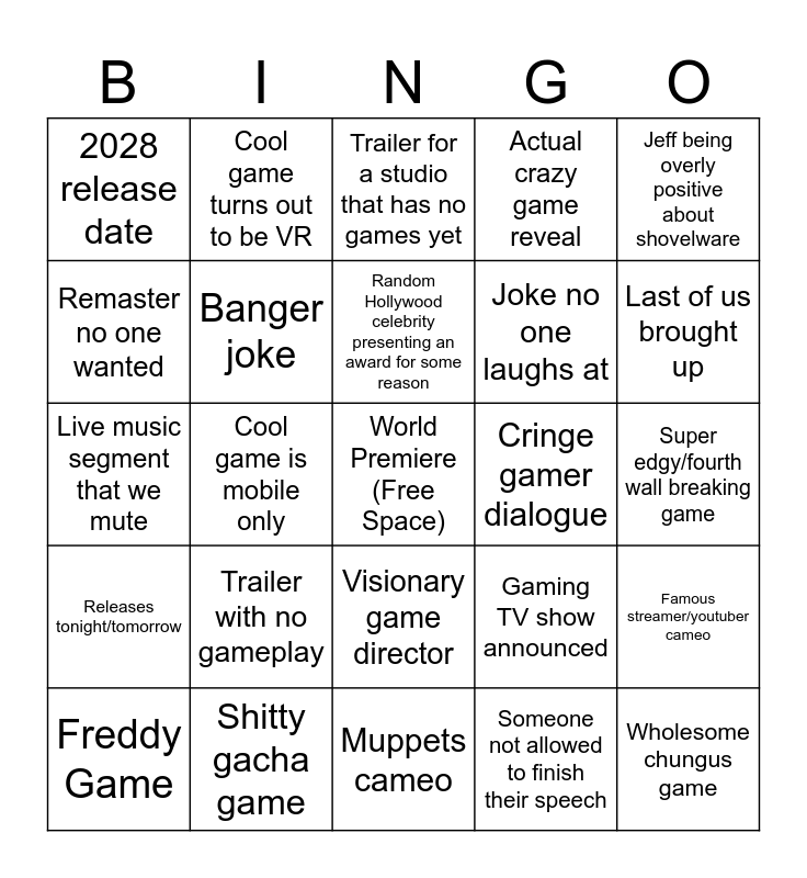 This bingo card has a free space and 24 words: Trailer with no gameplay, Shitty gacha game, Random Hollywood celebrity presenting an award for some reason, Freddy Game, Jeff being overly positive about shovelware, 2028 release date, Remaster no one wanted, Cool game turns out to be VR, Cringe gamer dialogue, Visionary game director, Joke no one laughs at, Live music segment that we mute, Gaming TV show announced, Famous streamer/youtuber cameo, Banger joke, Someone not allowed to finish their speech, Super edgy/fourth wall breaking game, Trailer for a studio that has no games yet, Last of us brought up, Cool game is mobile only, Wholesome chungus game, Releases tonight/tomorrow, Actual crazy game reveal and Muppets cameo.