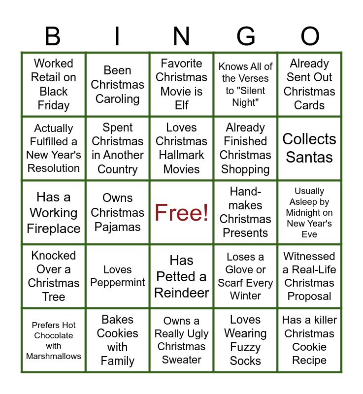 This bingo card has a free space and 24 words: Loves Peppermint, Bakes Cookies with Family, Loves Christmas Hallmark Movies, Prefers Hot Chocolate with Marshmallows, Already Sent Out Christmas Cards, Worked Retail on Black Friday, Actually Fulfilled a New Year's Resolution, Been Christmas Caroling, Hand-makes Christmas Presents, Has Petted a Reindeer, Already Finished Christmas Shopping, Has a Working Fireplace, Loses a Glove or Scarf Every Winter, Witnessed a Real-Life Christmas Proposal, Spent Christmas in Another Country, Loves Wearing Fuzzy Socks, Usually Asleep by Midnight on New Year's Eve, Favorite Christmas Movie is Elf, Collects Santas, Owns Christmas Pajamas, Has a killer Christmas Cookie Recipe, Knocked Over a Christmas Tree, Knows All of the Verses to "Silent Night" and Owns a Really Ugly Christmas Sweater.
