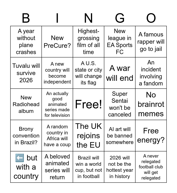 This bingo card has a free space and 24 words: A random country in Africa will have a coup, A beloved animated series will return, A U.S. state or city will change its flag, ⬅️ but with a country, A famous rapper will go to jail, A year without plane crashes, Tuvalu will survive 2026, New PreCure?, Super Sentai won't be canceled, The UK rejoins the EU, A war will end, New Radiohead album, AI art will be banned somewhere, Free energy?, A new country will become independent, 2026 will not be the hottest year in history, No brainrot memes, Highest-grossing film of all time, An incident involving a fandom, An actually good animated series made for television, A never relegated football club will get relegated, Brony convention in Brazil?, New league in EA Sports FC and Brazil will win a world cup, but not in football.