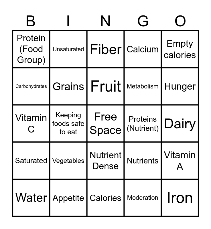 This bingo card has a free space and 27 words: Nutrients, Nutrition, Metabolism, Calories, Carbohydrates, Fiber, Unsaturated, Saturated, Proteins (Nutrient), Vitamin A, Vitamin C, Calcium, Water, Appetite, Hunger, MyPlate, Grains, Fruit, Vegetables, Protein (Food Group), Dairy, Moderation, Keeping foods safe to eat, Iron, Nutrient Dense, Empty calories and Amino Acid.