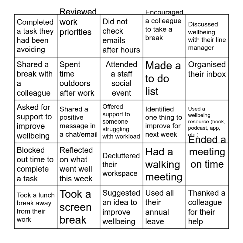 This bingo card has a free space and 29 words: Took a lunch break away from their work, Finished work on time, Shared a positive message in a chat/email, Joined a team social activity, Completed a task they had been avoiding, Did not check emails after hours, Spent time outdoors after work, Reflected on what went well this week, Identified one thing to improve for next week, Took a screen break, Used a wellbeing resource (book, podcast, app, etc.), Thanked a colleague for their help, Suggested an idea to improve wellbeing, Used all their annual leave, Organised their inbox, Planned time in the day for excerise, Decluttered their workspace, Blocked out time to complete a task, Discussed wellbeing with their line manager, Asked for support to improve wellbeing, Had a walking meeting, Participated in a staff challenge, Made a to do list, Shared a break with a colleague, Encouraged a colleague to take a break, Reviewed work priorities, Ended a meeting on time, Attended a staff social event and Scheduled personal downtime.