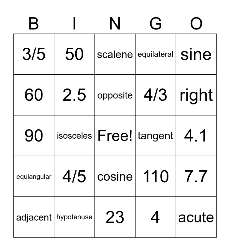 This bingo card has a free space and 24 words: 4/5, hypotenuse, opposite, adjacent, sine, 3/5, 60, 50, tangent, cosine, 4/3, 90, 110, 7.7, 2.5, 4, 4.1, scalene, right, isosceles, acute, equiangular, equilateral and 23.