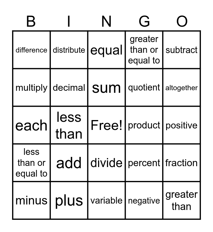 This bingo card has a free space and 24 words: add, plus, sum, minus, subtract, difference, multiply, distribute, product, divide, quotient, each, percent, fraction, decimal, negative, positive, equal, altogether, less than, greater than, less than or equal to, greater than or equal to and variable.