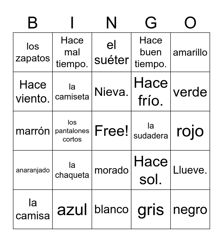 This bingo card has a free space and 29 words: la camisa, los pantalones, los pantalones cortos, los calcetines, los zapatos, el suéter, la camiseta, la chaqueta, la sudadera, azul, rojo, negro, blanco, gris, verde, rosado, morado, anaranjado, amarillo, marrón, Hace sol., Hace calor., Hace frío., Hace viento., Hace buen tiempo., Hace mal tiempo., Llueve., Nieva. and Hay nubes..