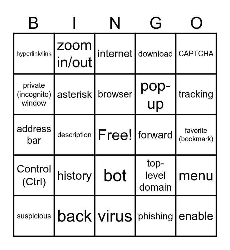 This bingo card has a free space and 40 words: ad, address bar, anti-malware/anti-virus, asterisk, back, bot, browser, cable/DSL, CAPTCHA, Control (Ctrl), description, download, enable, favorite (bookmark), forward, history, homepage, hyperlink/link, images, internet, menu, phishing, pop-up, private (incognito) window, refresh, search bar, search engine, search results, search terms, secure, shortcut, suspicious, tab, top-level domain, tracking, virus, web address/URL, wireless, zoom in/out and not secure.