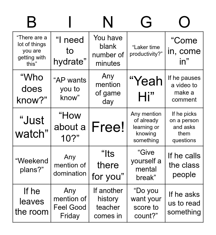 This bingo card has a free space and 24 words: Any mention of domination, Any mention of Feel Good Friday, Any mention of game day, If he leaves the room, “Come in, come in”, “There are a lot of things you are getting with this”, “Who does know?”, “I need to hydrate”, Any mention of already learning or knowing something, “Its there for you”, “Yeah Hi”, “Just watch”, “Give yourself a mental break”, If he calls the class people, “AP wants you to know”, “Do you want your score to count?”, If he picks on a person and asks them questions, You have blank number of minutes, If he pauses a video to make a comment, “How about a 10?”, If he asks us to read something, “Weekend plans?”, “Laker time productivity?” and If another history teacher comes in.