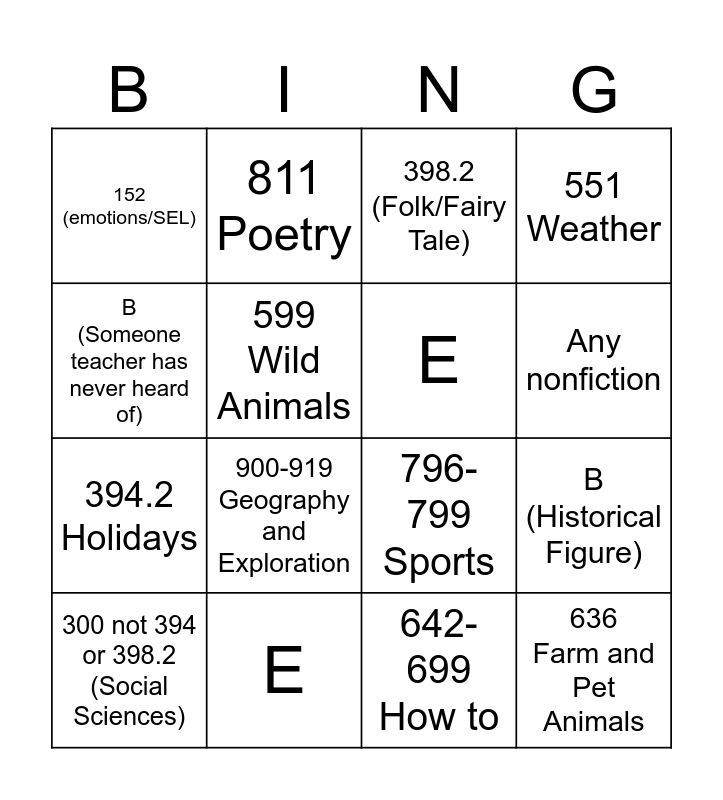 This bingo card has 16 words: E, B (Historical Figure), 398.2 (Folk/Fairy Tale), 152 (emotions/SEL), 394.2 Holidays, 811 Poetry, 796-799 Sports, 642-699 How to, B (Someone teacher has never heard of), 599 Wild Animals, 300 not 394 or 398.2 (Social Sciences), 551 Weather, 900-919 Geography and Exploration, Any nonfiction, E and 636 Farm and Pet Animals.