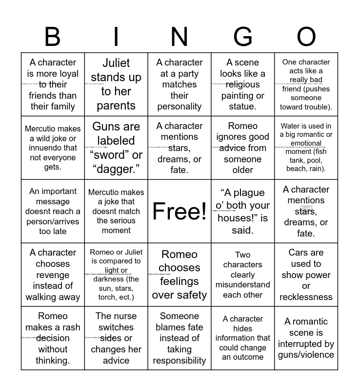 This bingo card has 14 images, a free space and 24 words: Romeo or Juliet is compared to light or darkness (the sun, stars, torch, ect.), The nurse switches sides or changes her advice, A character mentions stars, dreams, or fate., Romeo makes a rash decision without thinking., One character acts like a really bad friend (pushes someone toward trouble)., A character is more loyal to their friends than their family, Mercutio makes a wild joke or innuendo that not everyone gets., Juliet stands up to her parents, “A plague o’ both your houses!” is said., Romeo chooses feelings over safety, Romeo ignores good advice from someone older, An important message doesnt reach a person/arrives too late, Two characters clearly misunderstand each other, Cars are used to show power or recklessness, Guns are labeled “sword” or “dagger.”, A character hides information that could change an outcome, A character mentions stars, dreams, or fate., A character at a party matches their personality, Water is used in a big romantic or emotional moment (fish tank, pool, beach, rain)., Mercutio makes a joke that doesnt match the serious moment, A romantic scene is interrupted by guns/violence, A character chooses revenge instead of walking away, A scene looks like a religious painting or statue. and Someone blames fate instead of taking responsibility.