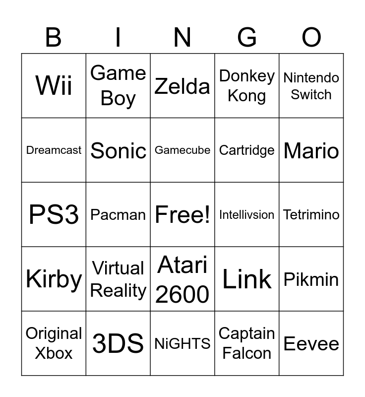 This bingo card has a free space and 24 words: Virtual Reality, 3DS, Gamecube, Original Xbox, Nintendo Switch, Wii, Dreamcast, Game Boy, Intellivsion, Atari 2600, Cartridge, PS3, Link, Pikmin, Sonic, Captain Falcon, Tetrimino, Zelda, Mario, Pacman, Eevee, Kirby, Donkey Kong and NiGHTS.