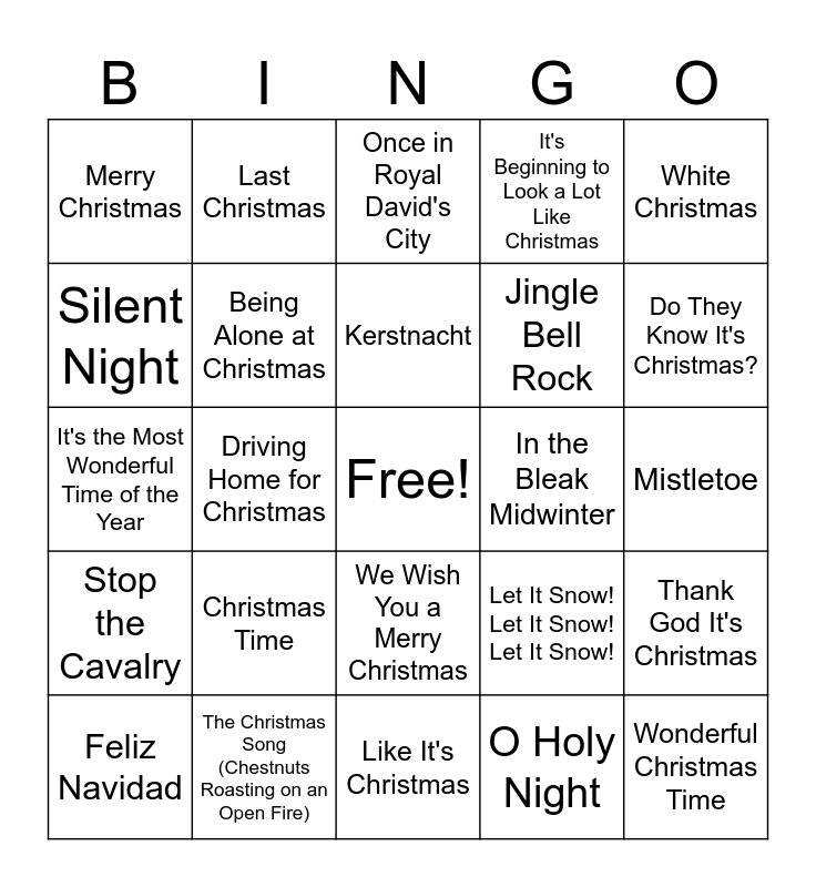 This bingo card has a free space and 72 words: All I Want for Christmas Is You, Last Christmas, Driving Home for Christmas, Sleigh Ride, Underneath the Tree, Santa Tell Me, It's Beginning to Look a Lot Like Christmas, Rockin' Around the Christmas Tree, Jingle Bell Rock, Merry Christmas Everyone, Feliz Navidad, Snowman, Do They Know It's Christmas?, Merry Christmas, Happy Xmas (War Is Over), It's the Most Wonderful Time of the Year, Let It Snow! Let It Snow! Let It Snow!, White Christmas, Santa Claus Is Coming to Town, Mistletoe, Christmas Time, Wonderful Christmas Time, Thank God It's Christmas, Christmas Lights, Flappie, Shake Up Christmas, Rudolph the Red-Nosed Reindeer, Holly Jolly Christmas, Blue Christmas, Have Yourself a Merry Little Christmas, The Christmas Song (Chestnuts Roasting on an Open Fire), Deck the Halls, Jingle Bells, Winter Wonderland, O Holy Night, Little Drummer Boy, Carol of the Bells, Mary's Boy Child, Silent Night, Joy to the World, We Wish You a Merry Christmas, Santa Baby, Step Into Christmas, I Wish It Could Be Christmas Everyday, Mistletoe and Wine, Stop the Cavalry, 2000 Miles, Up on the Housetop, O Come All Ye Faithful, The First Noel, God Rest Ye Merry Gentlemen, Hark! The Herald Angels Sing, Good King Wenceslas, In the Bleak Midwinter, Away in a Manger, Ding Dong Merrily on High, Once in Royal David's City, Kerstnacht, Winter in mijn hart, Laat het Sneeuwen, Dit is Kerst, Kerst zonder Jou, De Kerstster, Like It's Christmas, My Only Wish (This Year), Lonely This Christmas, Being Alone at Christmas, We All Stand Together, It's Gonna Be A Cold Cold Christmas, Please Come Home for Christmas, Christmas (Baby Please Come Home) and All Alone on Christmas.
