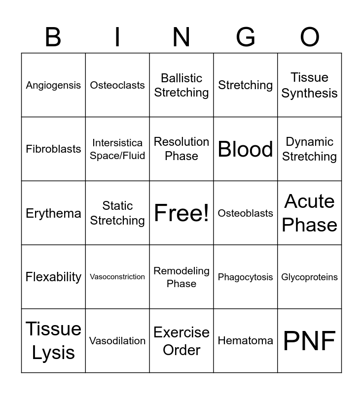 This bingo card has a free space and 24 words: Vasoconstriction, Vasodilation, Resolution Phase, Tissue Lysis, Tissue Synthesis, Angiogensis, Fibroblasts, Osteoclasts, Osteoblasts, Remodeling Phase, Blood, Erythema, Phagocytosis, Glycoproteins, Intersistica Space/Fluid, Hematoma, Acute Phase, Ballistic Stretching, Dynamic Stretching, Static Stretching, PNF, Flexability, Stretching and Exercise Order.