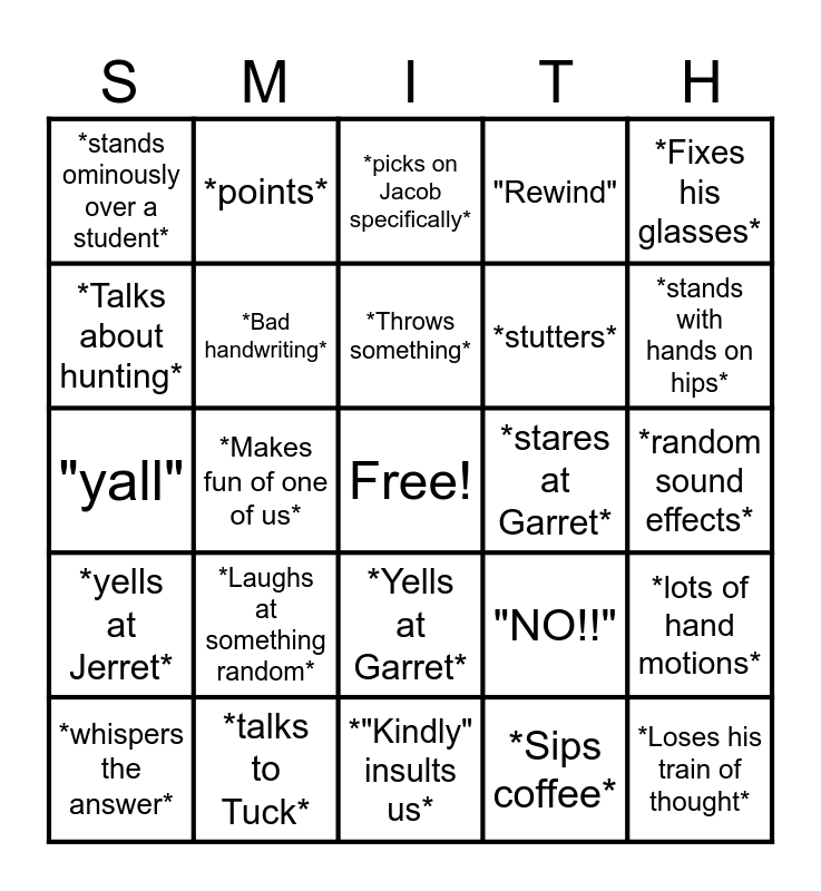 This bingo card has a free space and 39 words: "Back on the Farm", *randomly leans against stuff*, *stares at Garret*, *Bad handwriting*, *whispers the answer*, *Yells at Garret*, *Throws something*, *intensely stares*, *Fixes his glasses*, *yells at Jerret*, *Makes fun of one of us*, "Rewind", *Loses his train of thought*, *random sound effects*, *stares at Garret*, *Laughs at something random*, *Yells*, *stands ominously over a student*, "SHHHH", "NO!!", *Talks about hunting*, *"Kindly" insults us*, *stutters*, *stands with hands on hips*, *wears a kilt*, *refills coffee*, *says answer multiple times*, *picks up coffee mug without drinking*, *pronounces a word wrong*, *points*, "Via", *leans against random things*, *picks on Jacob specifically*, *talks to Tuck*, *Sips coffee*, *over pronounces words*, *lots of hand motions*, "yall" and *dramatic pauses*.