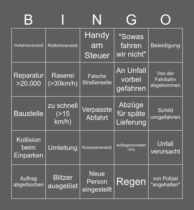 This bingo card has 25 words: Umleitung, Neue Person eingestellt, Falsche Straßenseite, Auftrag abgerbochen, Beleidigung, Vorfahrtsverstoß, Reparatur >20.000, Rotlichtverstoß, Abzüge für späte Lieferung, Ruhezeitverstoß, An Unfall vorbei gefahren, Baustelle, Aufliegerschaden >5%, Unfall verursacht, Raserei (>30km/h), von Polizei "angehalten", Schild umgefahren, Handy am Steuer, Von der Fahrbahn abgekommen, zu schnell (>15 km/h), Verpasste Abfahrt, Blitzer ausgelöst, Kollision beim Einparken, "Sowas fahren wir nicht" and Regen.