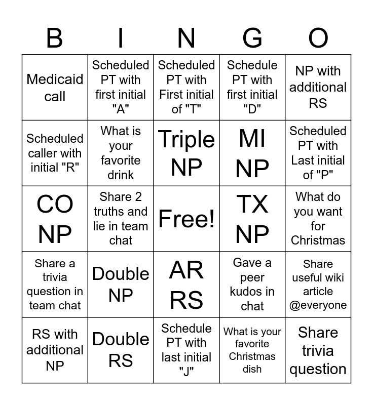 This bingo card has a free space and 24 words: Double NP, Double RS, Triple NP, RS with additional NP, NP with additional RS, Medicaid call, Scheduled caller with initial "R", Scheduled PT with first initial "A", TX NP, AR RS, MI NP, CO NP, Gave a peer kudos in chat, Share useful wiki article @everyone, What is your favorite drink, What is your favorite Christmas dish, What do you want for Christmas, Scheduled PT with First initial of "T", Scheduled PT with Last initial of "P", Share 2 truths and lie in team chat, Share trivia question, Share a trivia question in team chat, Schedule PT with first initial "D" and Schedule PT with last initial "J".