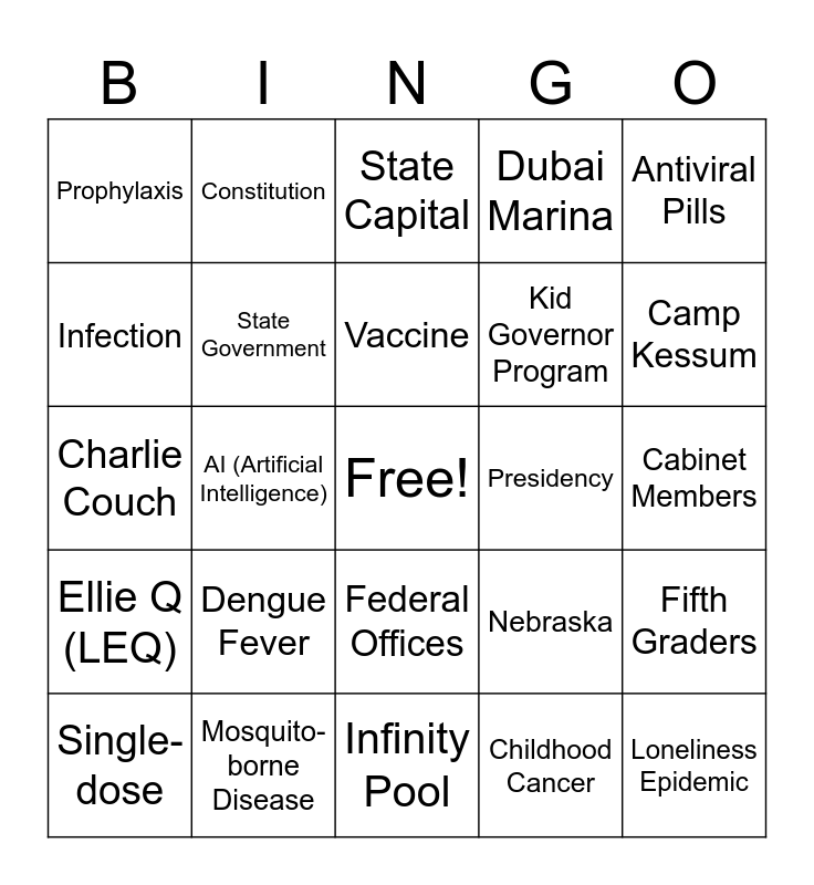 This bingo card has a free space and 24 words: Dengue Fever, Mosquito-borne Disease, Vaccine, Single-dose, Antiviral Pills, Prophylaxis, Infection, Constitution, Presidency, Federal Offices, Kid Governor Program, Charlie Couch, Nebraska, Fifth Graders, State Government, Childhood Cancer, Cabinet Members, State Capital, Camp Kessum, AI (Artificial Intelligence), Loneliness Epidemic, Ellie Q (LEQ), Dubai Marina and Infinity Pool.