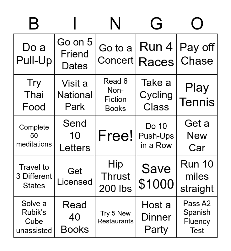 This bingo card has a free space and 24 words: Get Licensed, Read 40 Books, Read 6 Non-Fiction Books, Solve a Rubik's Cube unassisted, Pay off Chase, Do a Pull-Up, Try Thai Food, Go on 5 Friend Dates, Do 10 Push-Ups in a Row, Hip Thrust 200 lbs, Take a Cycling Class, Complete 50 meditations, Save $1000, Run 10 miles straight, Visit a National Park, Host a Dinner Party, Get a New Car, Go to a Concert, Play Tennis, Send 10 Letters, Pass A2 Spanish Fluency Test, Travel to 3 Different States, Run 4 Races and Try 5 New Restaurants.