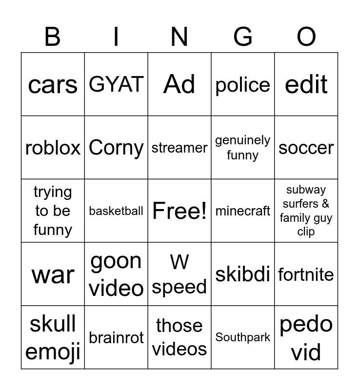 This bingo card has a free space and 24 words: goon video, brainrot, streamer, skull emoji, edit, cars, roblox, GYAT, minecraft, W speed, genuinely funny, trying to be funny, skibdi, fortnite, Corny, Southpark, subway surfers & family guy clip, Ad, soccer, basketball, pedo vid, war, police and those videos.