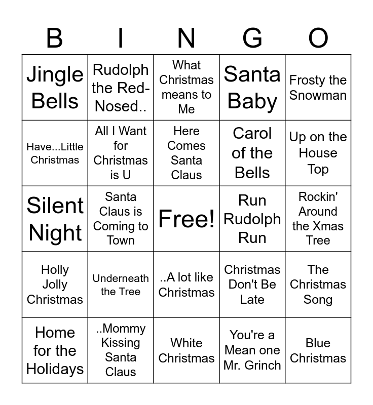 This bingo card has a free space and 37 words: Jingle Bell Rock, Let it Snow! Let it Snow!, Sleigh Ride, All I Want for Christmas is U, The Christmas Song, Underneath the Tree, Here Comes Santa Claus, Last Christmas, Frosty the Snowman, Officially Christmas, Santa Claus is Coming to Town, Santa Baby, Blue Christmas, Rockin' Around the Xmas Tree, Have...Little Christmas, Holly Jolly Christmas, ..Most Wonderful..of the Year, What Christmas means to Me, ..A lot like Christmas, Run Rudolph Run, Jingle Bells, Up on the House Top, Home for the Holidays, White Christmas, Mele Kalikimaka, You're a Mean one Mr. Grinch, Rudolph the Red-Nosed.., ..Hippopotamus for Christmas, Little Drummer Boy, My Grown-Up Christmas List, Hark! The Herald Angels Sing, ..Mommy Kissing Santa Claus, Silent Night, White Winter Hymnal, Christmas Don't Be Late, Carol of the Bells and O Come All Ye Faithful.