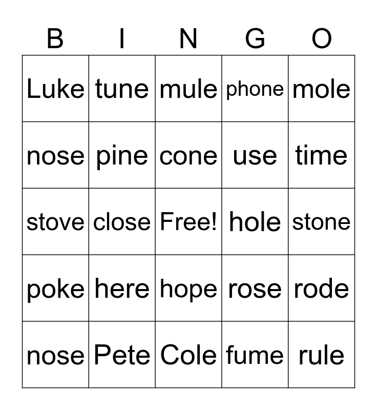 This bingo card has a free space and 39 words: Kate, rope, joke, pine, nose, hope, cone, home, mole, poke, close, phone, rule, stone, hole, here, shone, Luke, bone, rose, nose, Cole, use, time, cute, hide, flute, cubes, juice, tune, huge, tube, mule, Pete, fume, hike, rode, stove and lame.