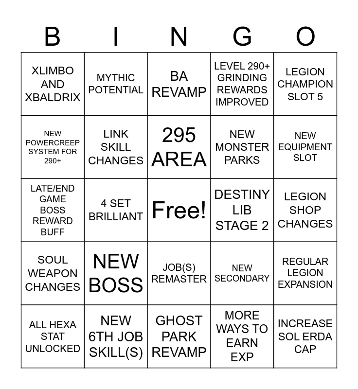 This bingo card has a free space and 24 words: NEW BOSS, NEW 6TH JOB SKILL(S), 295 AREA, ALL HEXA STAT UNLOCKED, LEGION CHAMPION SLOT 5, XLIMBO AND XBALDRIX, NEW POWERCREEP SYSTEM FOR 290+, MYTHIC POTENTIAL, DESTINY LIB STAGE 2, JOB(S) REMASTER, NEW MONSTER PARKS, LATE/END GAME BOSS REWARD BUFF, NEW SECONDARY, REGULAR LEGION EXPANSION, LINK SKILL CHANGES, MORE WAYS TO EARN EXP, LEGION SHOP CHANGES, BA REVAMP, NEW EQUIPMENT SLOT, 4 SET BRILLIANT, INCREASE SOL ERDA CAP, SOUL WEAPON CHANGES, LEVEL 290+ GRINDING REWARDS IMPROVED and GHOST PARK REVAMP.