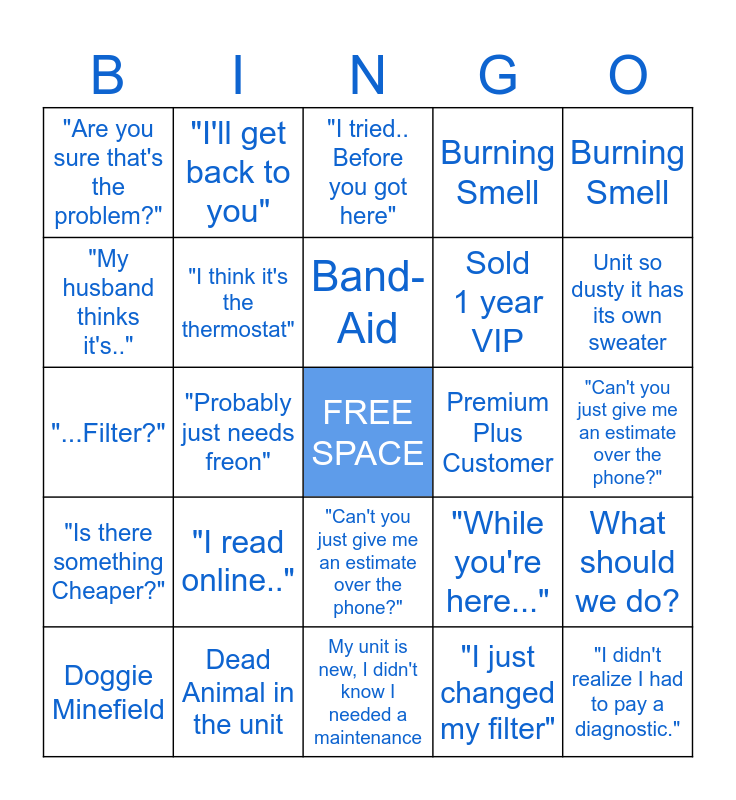 This bingo card has a free space and 28 words: What should we do?, "Someone else already told me what the problem was", Sold 1 year VIP, "I just changed my filter", "My husband thinks it's..", "I tried.. Before you got here", "I'll get back to you", "Is there something Cheaper?", Premium Plus Customer, Doggie Minefield, "...Filter?", Burning Smell, Dead Animal in the unit, My unit is new, I didn't know I needed a maintenance, Unit so dusty it has its own sweater, Clutter blocking the work area, "I read online..", "I think it's the thermostat", Band-Aid, "Can't you just give me an estimate over the phone?", "Are you sure that's the problem?", Helicopter Customer, "I didn't realize I had to pay a diagnostic.", "Probably just needs freon", "Can't you just give me an estimate over the phone?", "While you're here...", Burning Smell and Compressor.