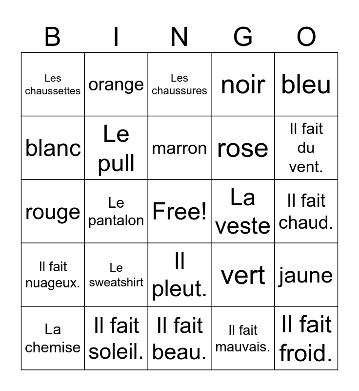 This bingo card has a free space and 29 words: La chemise, Le t-shirt, Le pantalon, Le short, Les chaussettes, Les chaussures, Le pull, Le sweatshirt, La veste, Il fait soleil., Il fait chaud., Il fait froid., Il fait beau., Il fait mauvais., Il fait du vent., Il neige., Il pleut., Il fait nuageux., bleu, rouge, vert, violet, rose, blanc, noir, orange, jaune, marron and gris.