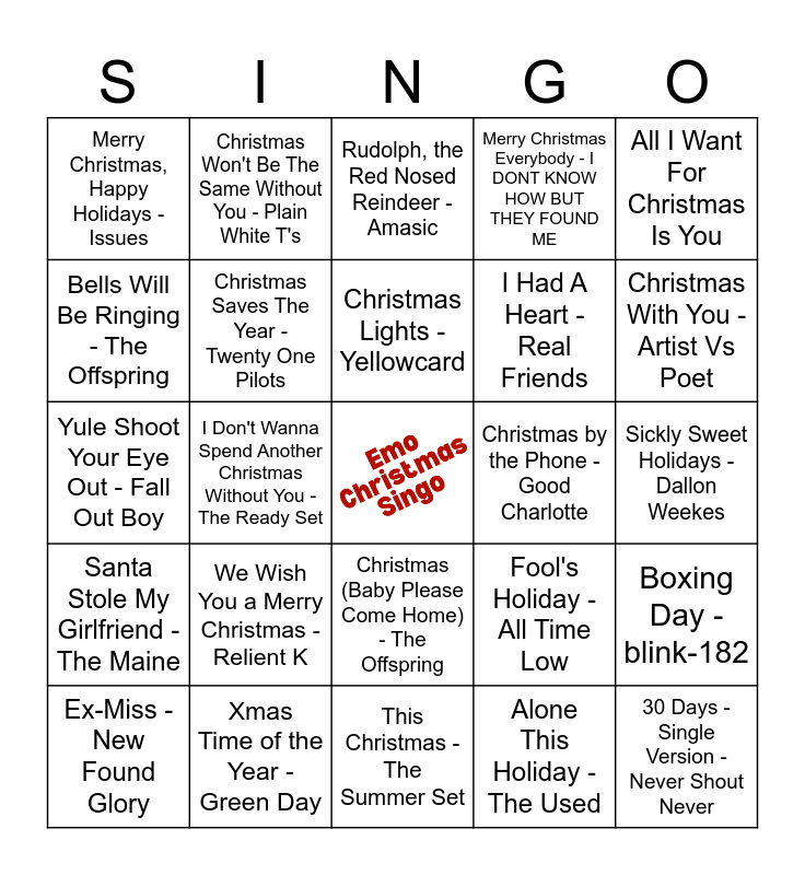Emo Holiday Bingo - Artist | Emo Holiday Bingo - Artist | bands that have somehow entered my playlist | Pop Punk Powerhouses | Shrugs' Cringe Music & Fail Bands
