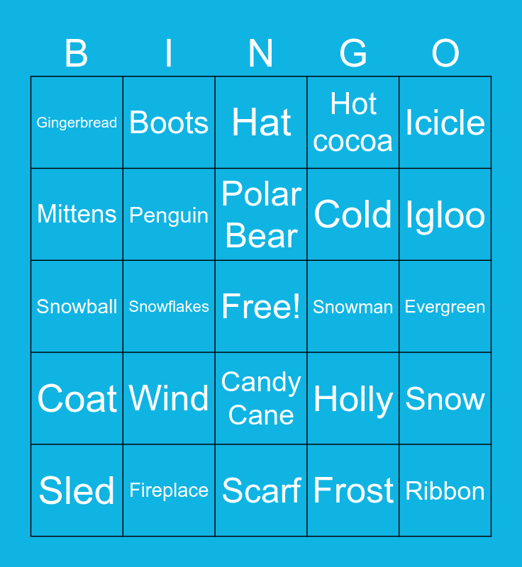 This bingo card has a free space and 28 words: Snow, Ice, Cold, Frost, Mittens, Hat, Boots, Coat, Snowman, Sled, Snowball, Hot cocoa, Fireplace, Scarf, Igloo, Blanket, Wind, Penguin, Polar Bear, Candy Cane, Gingerbread, Marshmallows, Ribbon, Snowflakes, Evergreen, Holly, Icicle and Pinecone.