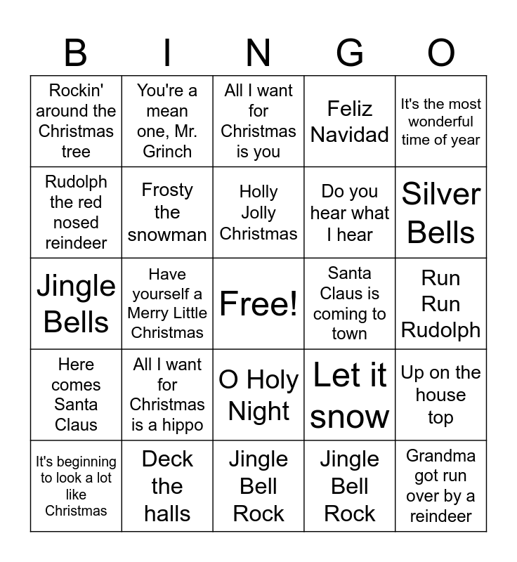 This bingo card has a free space and 24 words: It's beginning to look a lot like Christmas, All I want for Christmas is a hippo, Holly Jolly Christmas, Jingle Bell Rock, It's the most wonderful time of year, Rockin' around the Christmas tree, You're a mean one, Mr. Grinch, All I want for Christmas is you, Santa Claus is coming to town, Run Run Rudolph, Jingle Bells, Frosty the snowman, Let it snow, Up on the house top, Rudolph the red nosed reindeer, Deck the halls, Jingle Bell Rock, Feliz Navidad, Silver Bells, Here comes Santa Claus, Have yourself a Merry Little Christmas, O Holy Night, Do you hear what I hear and Grandma got run over by a reindeer.