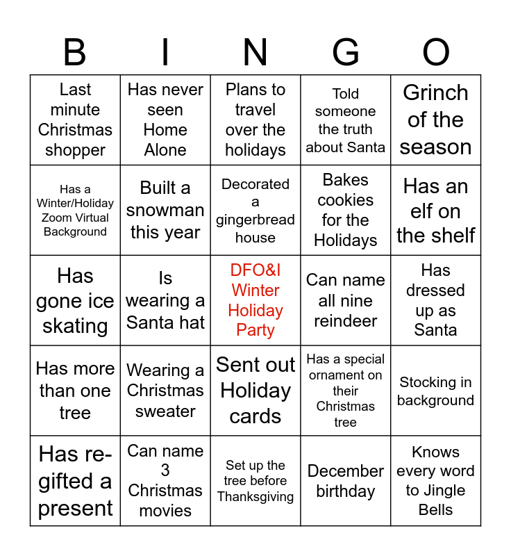 This bingo card has a free space and 24 words: Wearing a Christmas sweater, Can name 3 Christmas movies, Decorated a gingerbread house, Has re-gifted a present, Grinch of the season, Last minute Christmas shopper, Has a Winter/Holiday Zoom Virtual Background, Has never seen Home Alone, Can name all nine reindeer, Sent out Holiday cards, Bakes cookies for the Holidays, Has gone ice skating, Has a special ornament on their Christmas tree, Stocking in background, Built a snowman this year, December birthday, Has dressed up as Santa, Plans to travel over the holidays, Has an elf on the shelf, Is wearing a Santa hat, Knows every word to Jingle Bells, Has more than one tree, Told someone the truth about Santa and Set up the tree before Thanksgiving.