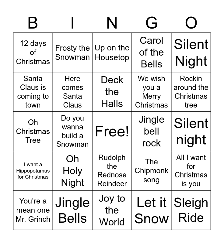 This bingo card has a free space and 24 words: Oh Holy Night, Jingle Bells, Deck the Halls, You’re a mean one Mr. Grinch, Silent Night, 12 days of Christmas, Santa Claus is coming to town, Frosty the Snowman, Jingle bell rock, Rudolph the Rednose Reindeer, We wish you a Merry Christmas, Oh Christmas Tree, The Chipmonk song, All I want for Christmas is you, Here comes Santa Claus, Let it Snow, Silent night, Up on the Housetop, Rockin around the Christmas tree, Do you wanna build a Snowman, Sleigh Ride, I want a Hippopotamus for Christmas, Carol of the Bells and Joy to the World.