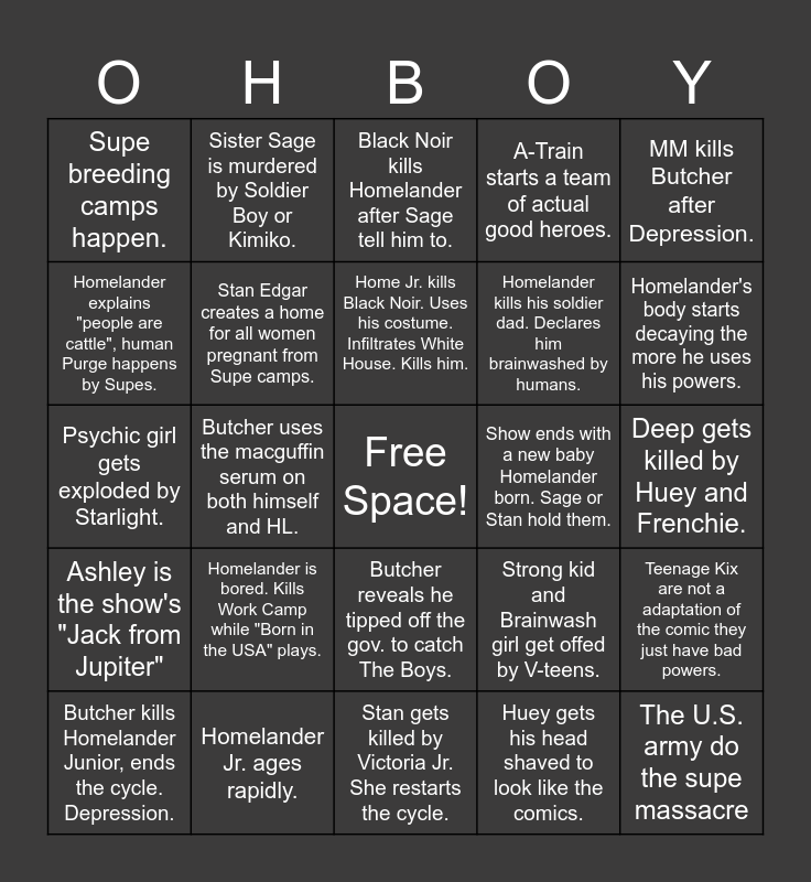 This bingo card has a free space and 24 words: Homelander is bored. Kills Work Camp while "Born in the USA" plays., Homelander Jr. ages rapidly., Home Jr. kills Black Noir. Uses his costume. Infiltrates White House. Kills him., Butcher kills Homelander Junior, ends the cycle. Depression., MM kills Butcher after Depression., Supe breeding camps happen., Homelander explains "people are cattle", human Purge happens by Supes., Sister Sage is murdered by Soldier Boy or Kimiko., Show ends with a new baby Homelander born. Sage or Stan hold them., Butcher reveals he tipped off the gov. to catch The Boys., Homelander kills his soldier dad. Declares him brainwashed by humans., Psychic girl gets exploded by Starlight., Strong kid and Brainwash girl get offed by V-teens., Teenage Kix are not a adaptation of the comic they just have bad powers., Stan Edgar creates a home for all women pregnant from Supe camps., Huey gets his head shaved to look like the comics., Deep gets killed by Huey and Frenchie., Black Noir kills Homelander after Sage tell him to., Homelander's body starts decaying the more he uses his powers., Butcher uses the macguffin serum on both himself and HL., The U.S. army do the supe massacre, Ashley is the show's "Jack from Jupiter", A-Train starts a team of actual good heroes. and Stan gets killed by Victoria Jr. She restarts the cycle..