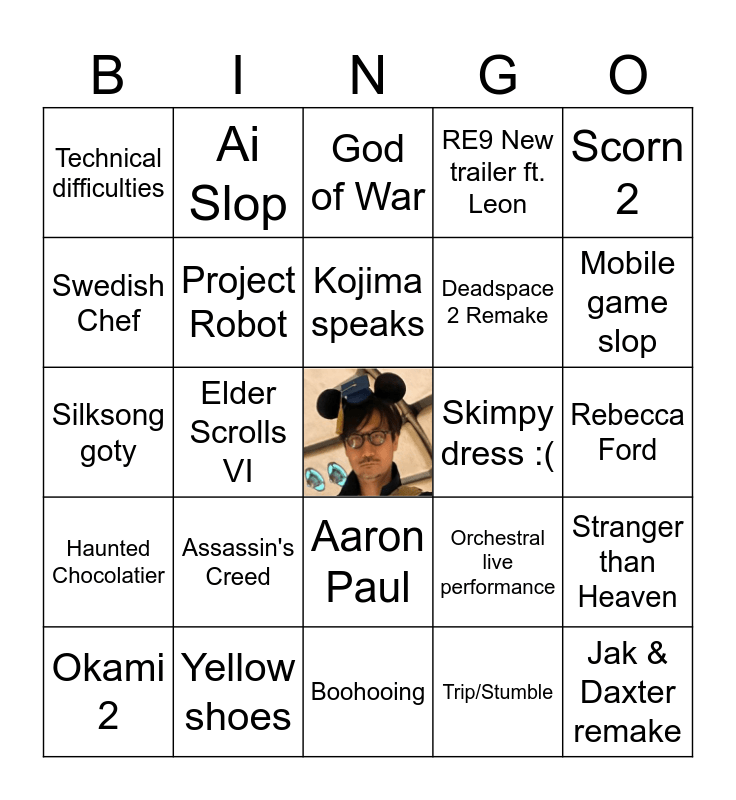 This bingo card has a free space and 24 words: Assassin's Creed, Yellow shoes, Kojima speaks, Okami 2, Scorn 2, Technical difficulties, Swedish Chef, Ai Slop, Skimpy dress :(, Aaron Paul, Deadspace 2 Remake, Silksong goty, Orchestral live performance, Stranger than Heaven, Project Robot, Trip/Stumble, Rebecca Ford, God of War, Mobile game slop, Elder Scrolls VI, Jak & Daxter remake, Haunted Chocolatier, RE9 New trailer ft. Leon and Boohooing.