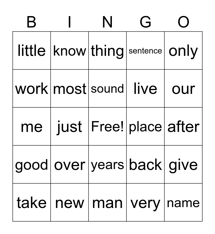 This bingo card has a free space and 24 words: over, new, sound, take, only, little, work, know, place, years, live, me, back, give, most, very, after, thing, our, just, name, good, sentence and man.