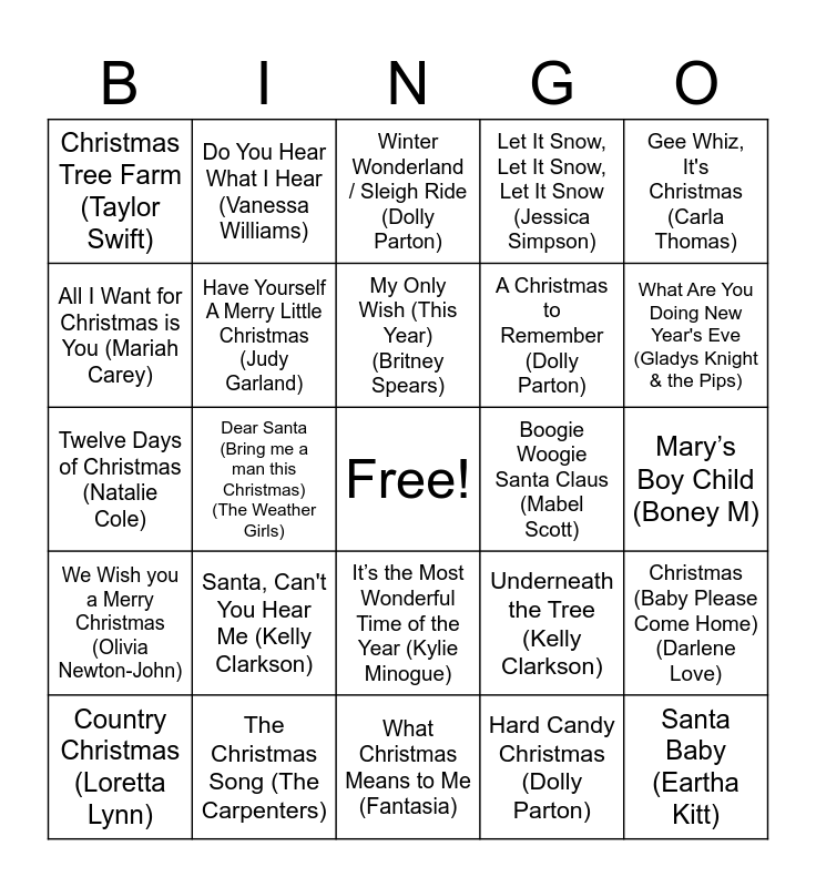 This bingo card has a free space and 53 words: Rockin' Around the Christmas Tree (Brenda Lee), Santa Baby (Eartha Kitt), Merry Christmas, Baby Please Come Home (Darlene Love), Hard Candy Christmas (Dolly Parton), Santa, Can't You Hear Me (Kelly Clarkson), Ave Maria (Celine Dion), Do You Hear What I Hear (Vanessa Williams), What Christmas Means to Me (Cher), All I Want for Christmas is You (Mariah Carey), Sleigh Ride (The Ronettes), Have Yourself A Merry Little Christmas (Judy Garland), Where Are You Christmas (Faith Hill), Christmas (Baby Please Come Home) (Darlene Love), Underneath the Tree (Kelly Clarkson), O Holy Night (Carrie Underwood), Country Christmas (Loretta Lynn), My Only Wish (This Year) (Britney Spears), Boogie Woogie Santa Claus (Mabel Scott), Little Drummer Boy (Joan Jett), Gee Whiz, It's Christmas (Carla Thomas), Dear Santa (Bring me a man this Christmas) (The Weather Girls), I Believe in Santa Claus (Dolly Parton), A Christmas to Remember (Dolly Parton), Christmas Tree Farm (Taylor Swift), Santa Tell Me (Ariana Grande), The Christmas Song (The Carpenters), I Saw Mommy Kissing Santa Claus (The Ronettes), Jingle Bells (Barbra Streisand), Winter Wonderland (Aretha Franklin), What Are You Doing New Year's Eve (Gladys Knight & the Pips), Do You Hear What I Hear? (Whitney Houston), Baby It's Cold Outside (Zooey Deschanel), Frosty the Snowman (The Ronettes), Santa Claus is Coming to Town (The Pointer Sisters), This Christmas (Christina Aguilera), My Kind of Present (Meghan Trainor), Let It Snow, Let It Snow, Let It Snow (Jessica Simpson), What Christmas Means to Me (Fantasia), Winter Wonderland / Sleigh Ride (Dolly Parton), Santa Claus is Coming to Town (Mariah Carey), Happy Christmas (War is Over) (Christina Perri), Feliz Navidad (Boney M), Mary’s Boy Child (Boney M), Auld Lang Syne (Boney M), I Want a Hippopotamus for Christmas (Gayla Peevey), It’s the Most Wonderful Time of the Year (Kylie Minogue), Rudolph the Red Nosed Reindeer (Ella Fitzgerald)47, A Holly Jolly Christmas (Lady A), Twelve Days of Christmas (Natalie Cole), We Wish you a Merry Christmas (Olivia Newton-John), A Marshmallow World (Brenda Lee), Christmas Cookies (Lainey Wilson) and Suzy Snowflake (Rosemary Clooney).