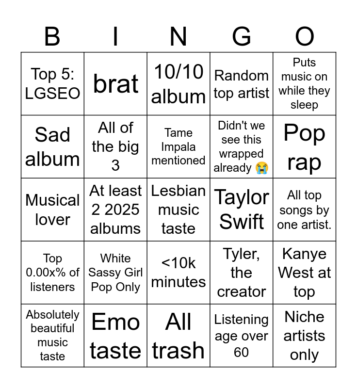 This bingo card has 25 words: White Sassy Girl Pop Only, All trash, Tame Impala mentioned, Absolutely beautiful music taste, Puts music on while they sleep, Top 5: LGSEO, Sad album, brat, Taylor Swift, <10k minutes, Didn't we see this wrapped already 😭, Musical lover, Tyler, the creator, Kanye West at top, All of the big 3, Niche artists only, All top songs by one artist., 10/10 album, Pop rap, At least 2 2025 albums, Lesbian music taste, Emo taste, Top 0.00x% of listeners, Random top artist and Listening age over 60.