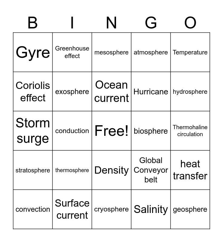 This bingo card has a free space and 26 words: Density, Salinity, Ocean current, Surface current, Temperature, Gyre, Coriolis effect, Greenhouse effect, Thermohaline circulation, Global Conveyor belt, Hurricane, Storm surge, heat transfer, convection, conduction, radiation, atmosphere, stratosphere, mesosphere, geosphere, hydrosphere, cryosphere, biosphere, thermosphere, exosphere and troposphere.