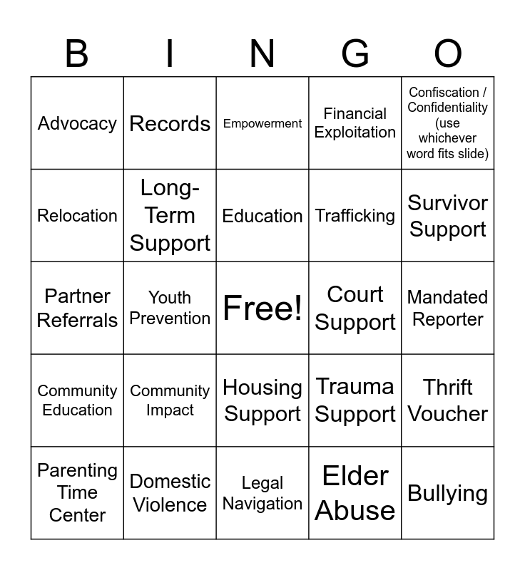 This bingo card has a free space and 30 words: Domestic Violence, Sexual Assault, Youth Prevention, Crisis Line, Advocacy, Empowerment, Long-Term Support, Housing Support, Court Support, Legal Navigation, Mandated Reporter, Bullying, Elder Abuse, Homicide Survivor Support, Survivor Support, Safety Planning, Trauma Support, Community Education, Community Impact, Confiscation / Confidentiality (use whichever word fits slide), Partner Referrals, Funding, Records, Trafficking, Relocation, Financial Exploitation, Thrift Voucher, Parenting Time Center, Education and Grievance Process.