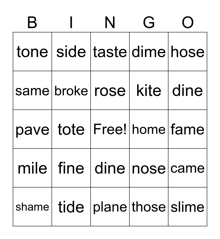 This bingo card has a free space and 37 words: paste, tie, rope, broke, came, fine, rose, plate, hose, stripe, tote, dime, slime, fame, same, mile, mime, taste, dine, home, tone, dine, shame, plane, site, those, side, bike, chime, cake, bike, tide, pave, choke, nose, kite and pride.