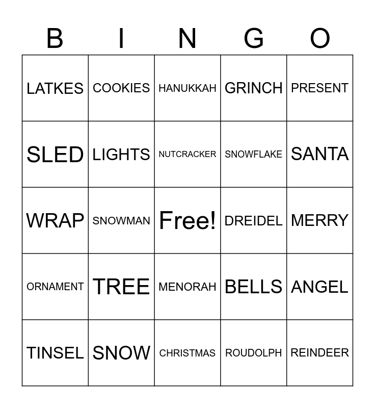 This bingo card has a free space and 30 words: SNOW, WINTER, SNOWMAN, GINGERBREAD, LATKES, HANUKKAH, LIGHTS, MENORAH, DREIDEL, CHRISTMAS, MERRY, REINDEER, ROUDOLPH, ELF, SANTA, SLEIGH, BELLS, ORNAMENT, TREE, PRESENT, WRAP, GIFT, COOKIES, SNOWFLAKE, SLED, GRINCH, ANGEL, TINSEL, NUTCRACKER and HO HO HO.
