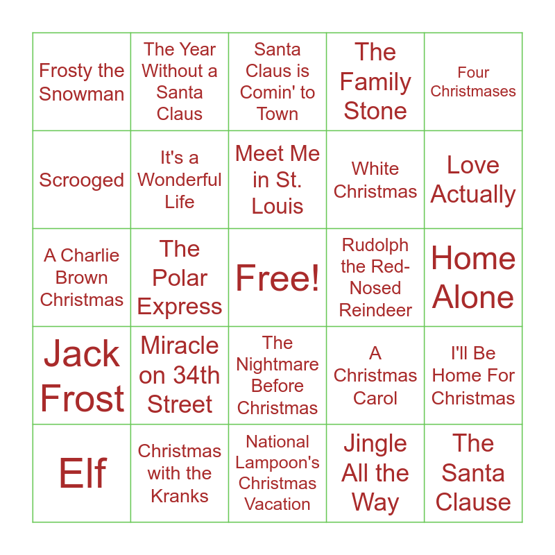 This bingo card has a free space and 29 words: Elf, A Christmas Story, The Polar Express, Christmas Chronicles, Frosty the Snowman, Santa Claus is Comin' to Town, It's a Wonderful Life, Miracle on 34th Street, Rudolph the Red-Nosed Reindeer, Christmas with the Kranks, Home Alone, The Santa Clause, National Lampoon's Christmas Vacation, Jingle All the Way, Love Actually, The Holiday, The Nightmare Before Christmas, Jack Frost, Four Christmases, A Charlie Brown Christmas, A Christmas Carol, The Family Man, White Christmas, Scrooged, The Family Stone, The Year Without a Santa Claus, I'll Be Home For Christmas, Meet Me in St. Louis and While You Were Sleeping.
