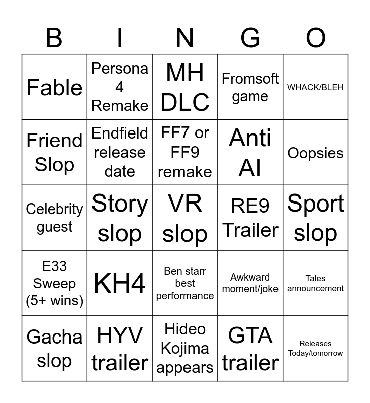This bingo card has a free space and 24 words: KH4, HYV trailer, FF7 or FF9 remake, Gacha slop, WHACK/BLEH, Fable, Friend Slop, Persona 4 Remake, RE9 Trailer, Ben starr best performance, Anti AI, Celebrity guest, Awkward moment/joke, Tales announcement, Endfield release date, GTA trailer, Sport slop, MH DLC, Oopsies, Story slop, Releases Today/tomorrow, E33 Sweep (5+ wins), Fromsoft game and Hideo Kojima appears.
